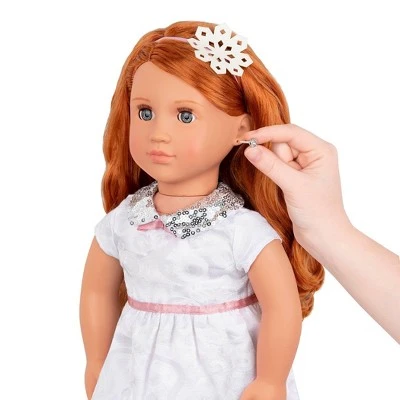 Start accessorizing with Julissa, the Our Generation 18-inch jewelry doll with pierced ears! She has beautiful dark-blue eyes that open and close, and her long red hair is fun to brush and style! Julissa arrives with a sparkling, snowflake-themed jewelry collection that features 2 pearl bracelets, a snowflake necklace, and 6 studded earrings to mix and match with any look. And the pink jewelry box holds every dazzling piece to keep them neatly organized! Julissa can rotate her neck, arms, and legs to easily change into stylish outfits, and the easy-open closures on her dress make it quick to put on and remove, so Julissa can try on other colorful clothes just as much as she tries on her jewelry! (Additional outfits sold separately)