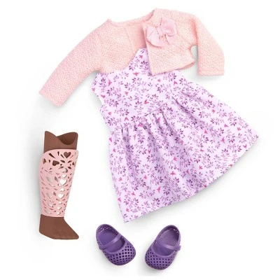 - Includes: doll, dress, undies, shrug, removable prosthetic leg, and shoes