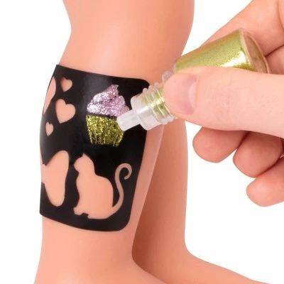 - 18-inch glitter tattoo doll with shoulder-length blonde hair & green eyes